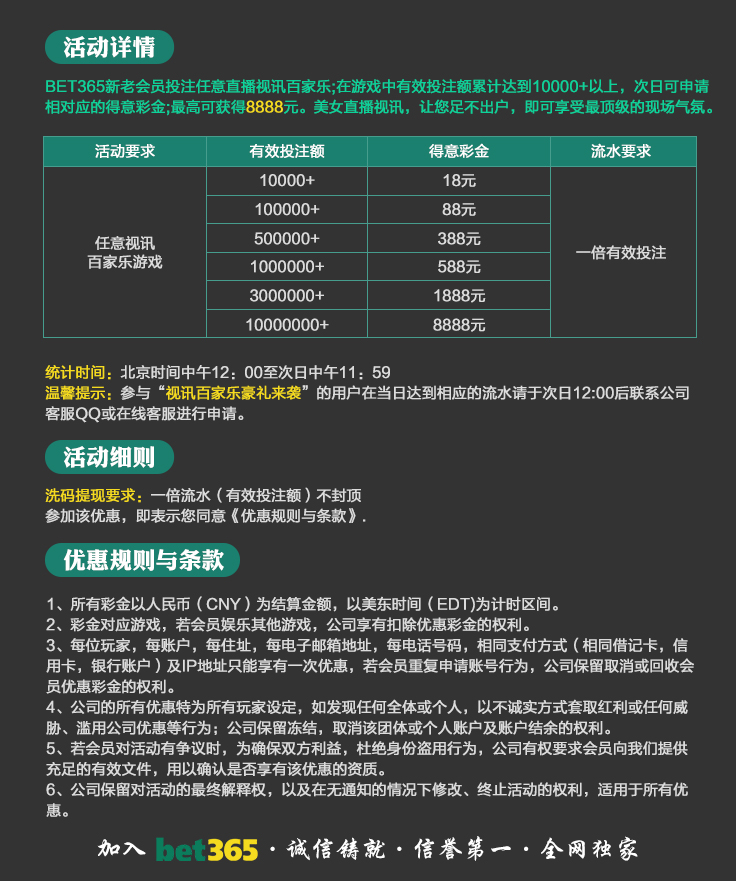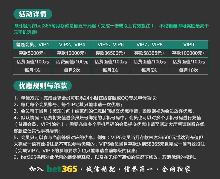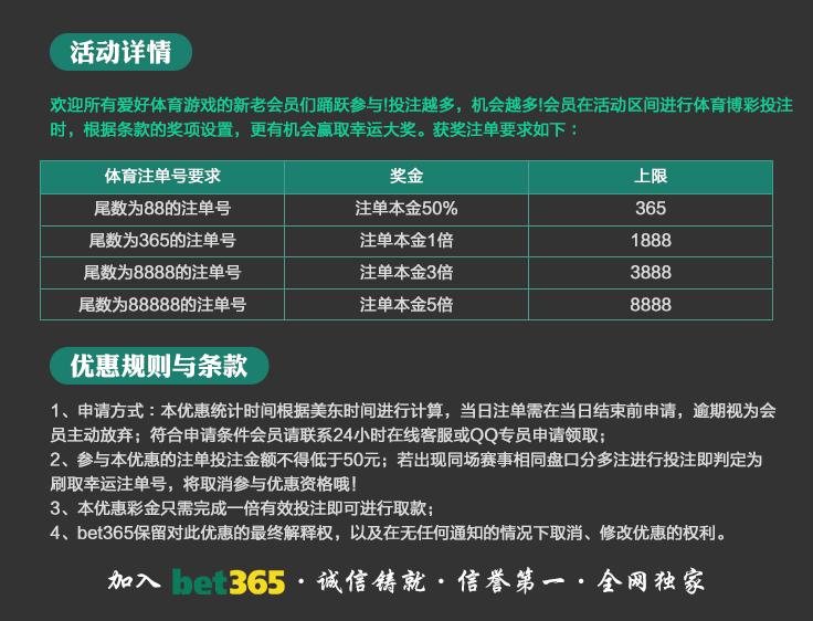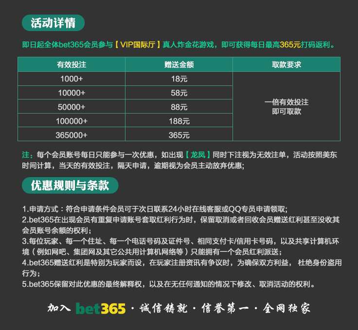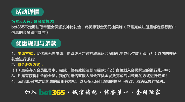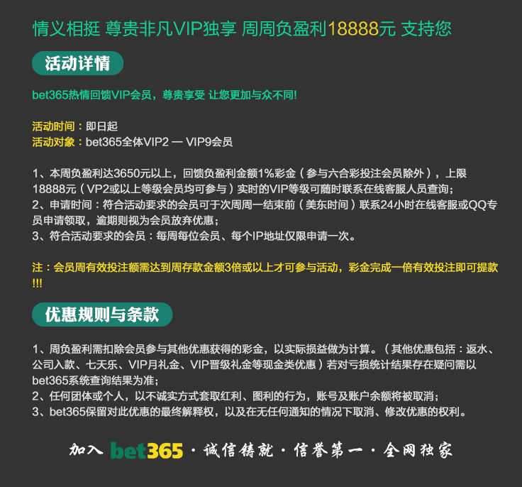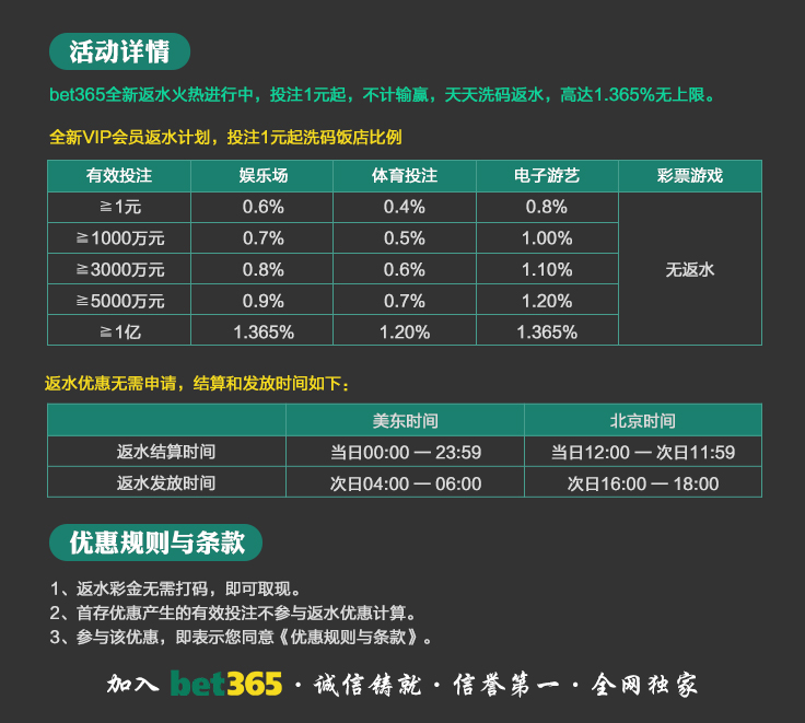 VIP消息★VIP晋级彩金及月好运彩金,第一百零八期已经全部派发完成,请会员自行登入账号查看,会员自身vip等级详情请点击“促销”查询。若有任何疑问可第一时间联系在线客服!bet365 运营团队宣 2025-8-18温馨提示:美东时间2025年10月20日天天返水优惠额度已发放至您的会员账户,请您登入账户查收!